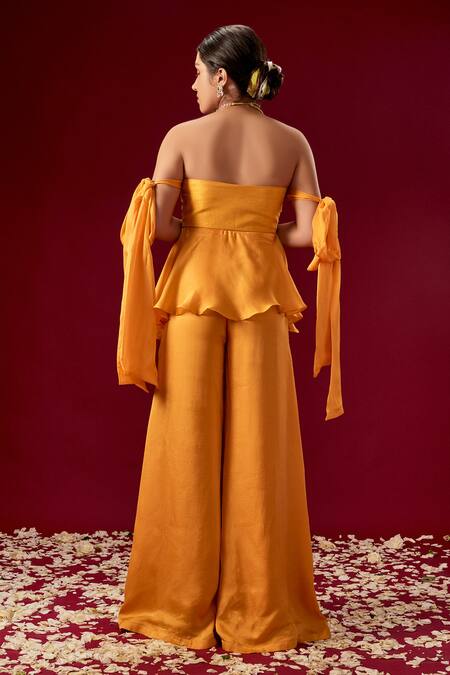 Yellow Satin Organza Sweetheart Neck Top And Pant Set