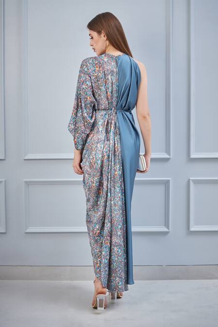 Petrol grey gown with digital print on one side and front slit. Comes with belt.