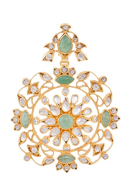 Exquisitely crafted in gold plated silver, embellished with vibrant green stones and crystals. This pair of dangler earrings is inspired by India's royal palatial architecture.