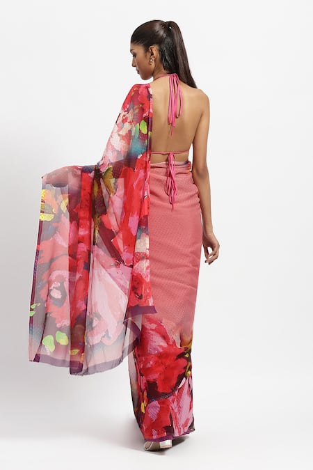 Pink saree featuring printed European rose motifs. Comes with a running blouse piece.