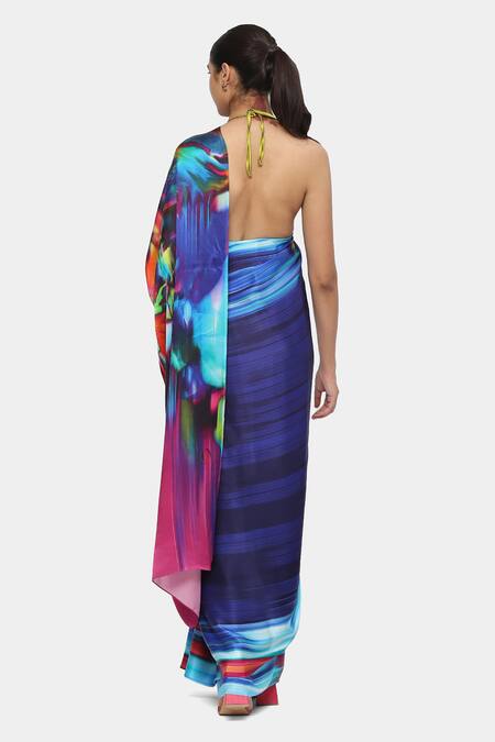 Buy_Satya Paul_Blue Satin, Georgette Astral Storm Print Saree With Running Blouse_Online_at_Aza_Fashions