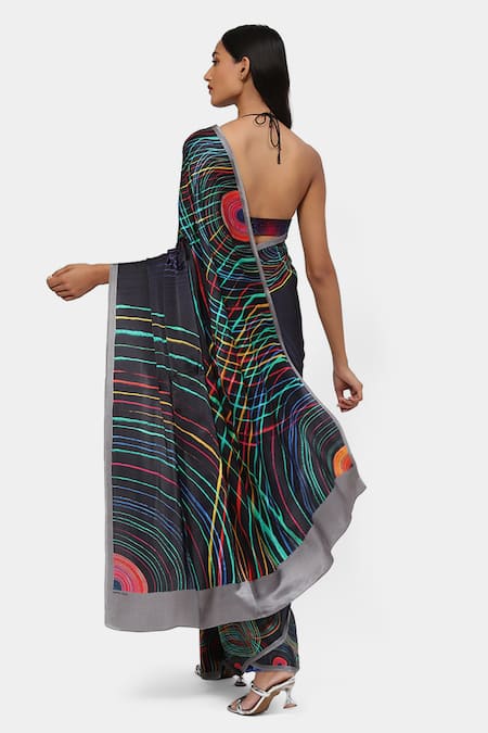 Indigo blue saree featuring a circular stripe pattern crafted in satin georgette with delicate embellishments