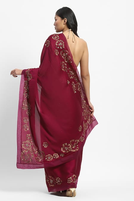 Wine saree featuring floral gold zari and sequins embroidery. Paired with a matching running blouse piece.