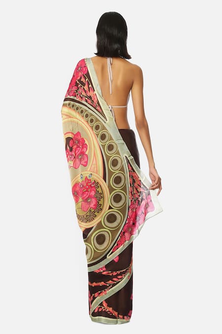 Dark brown saree with embellished detailing & art-deco inspired print. Comes with running blouse.