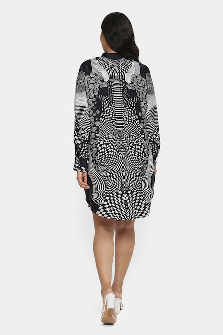 Black satin tunic featuring an all-over optical illusion inspired monochrome graphic print