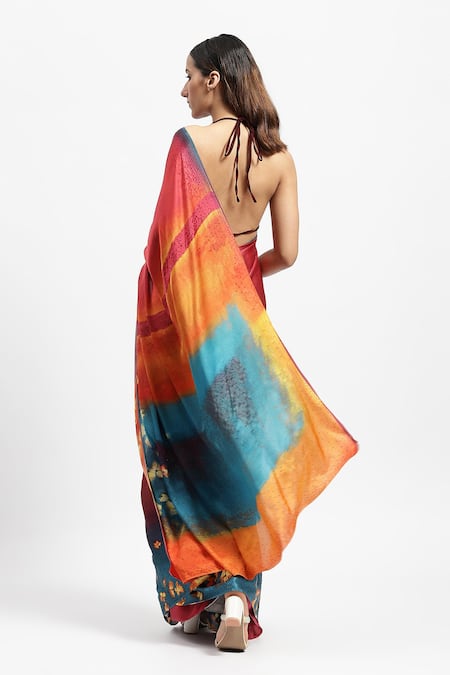 Red Silk Satin Hestia Burning Bloom Flame Print Saree With Running Blouse