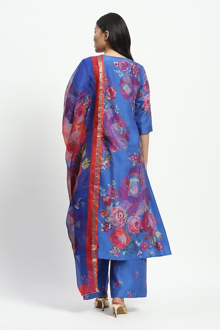 Blue kurta featuring a notched collar and three quarter sleeves with floral prints. Paired with a printed pant and contrast two tone dupatta.