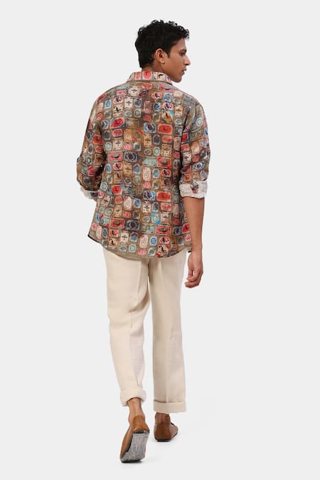Grey shirt featuring a collared neck and rolled up sleeves with an all-over letter stamp print