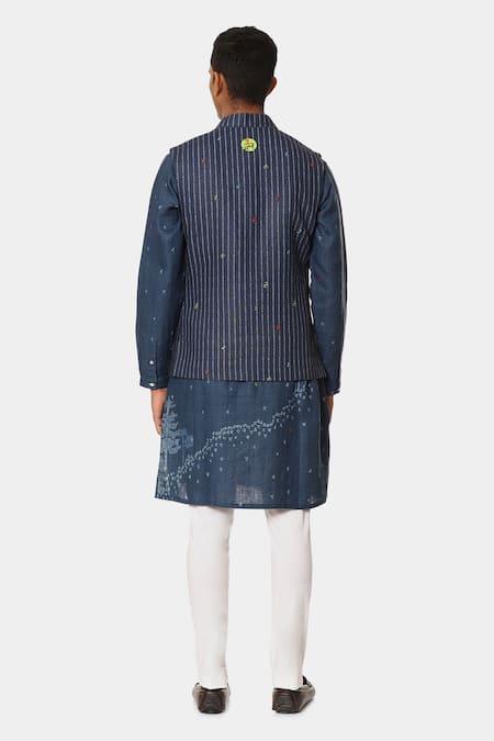 Blue linen bundi with scattered typographic print and welt pockets in front.