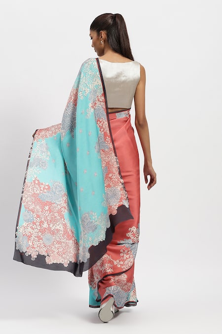 Faux lace work detailing on the saree, Floral print design, Contrast border highlighting the saree edges