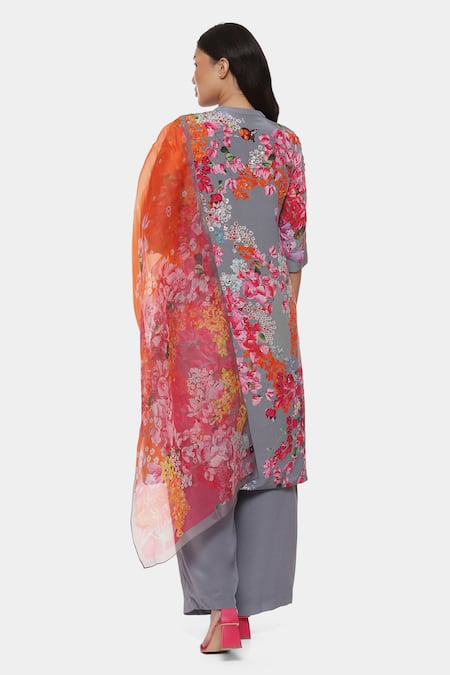 Grey kurta featuring floral prints and a mandarin collar. Paired with a sheer dupatta and relaxed fit pants.