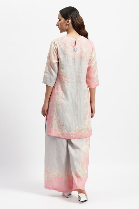 Pink Linen Embroidery Round Paradise Lace Embellished Kurta And Flared Pant Set