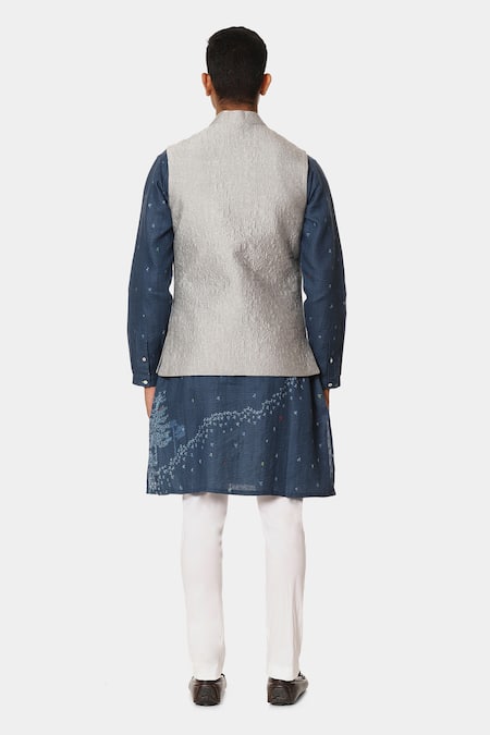 Grey bundi in a viscose base with stitchline embroidered motifs and welt pockets in front.