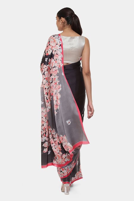 Black saree featuring hibiscus flower print with a contrast border