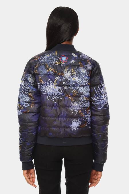 Blue reversible jacket featuring a garden print design and a mandarin collar