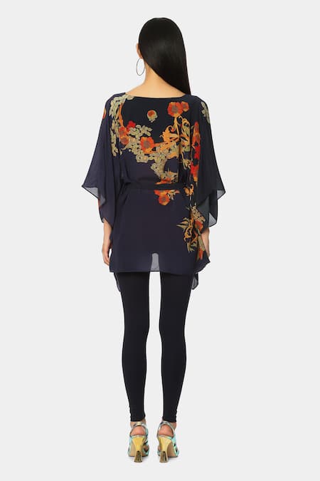 Blue kaftan top with floral printed motifs. Comes with separate fabric belt.
