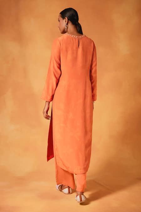 Tangerine orange A-line kurta featuring full sleeves and a subtle blossom print. Paired with a flared solid pant and a cutwork border foliage print dupatta embellished with beads.