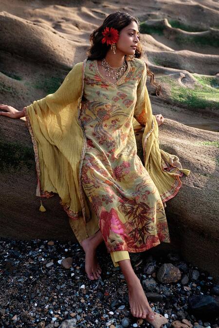 Botanical print design on the kurta, Embellished neckline with crystals and sequins, Tassel bordered dupatta