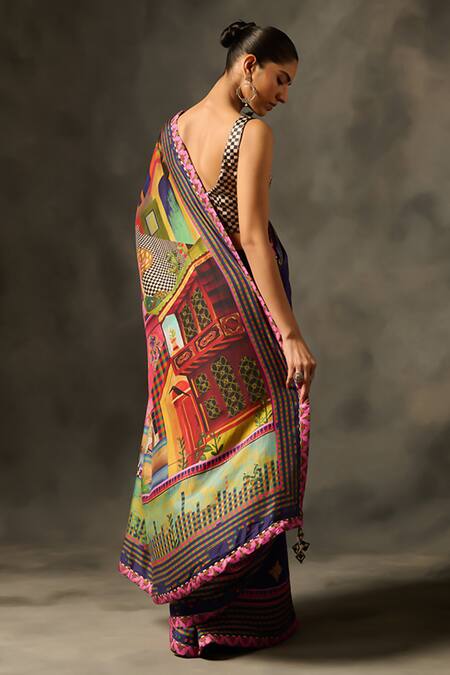 Checkered print design, Abstract motifs throughout the saree, Vibrant contrasting borders