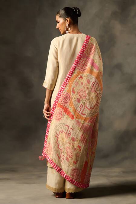 Flower placement woven motifs on kurta, Stripe woven pattern on pant, Printed dupatta with vibrant colors