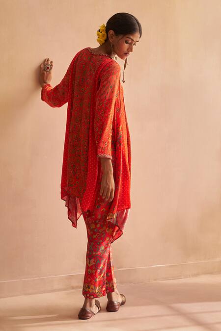 Red Crepe, Organza, Silk Sequins, Nadiya Abstract Floral Print Kurta Pant Set