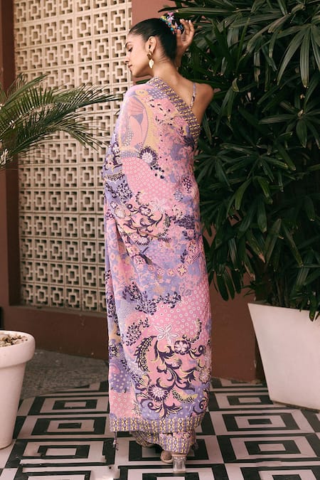 Purple saree crafted in natural crepe featuring an all-over print and a cutwork border. Comes with a matching unstitched blouse piece adorned with metallic tassels.