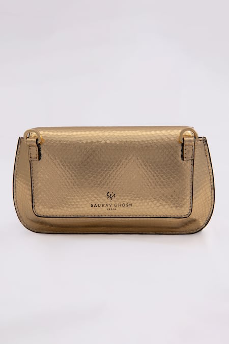 Gold clutch featuring a textured pattern and animal, floral carved brooch. Comes with a detachable sling for versatile carrying options.