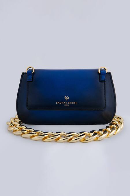 Royal blue rectangle shaped clutch featuring a stitchline embroidered border and a 24k gold plated animal carved brooch in the center. Comes with a detachable small sling for versatile carrying options.