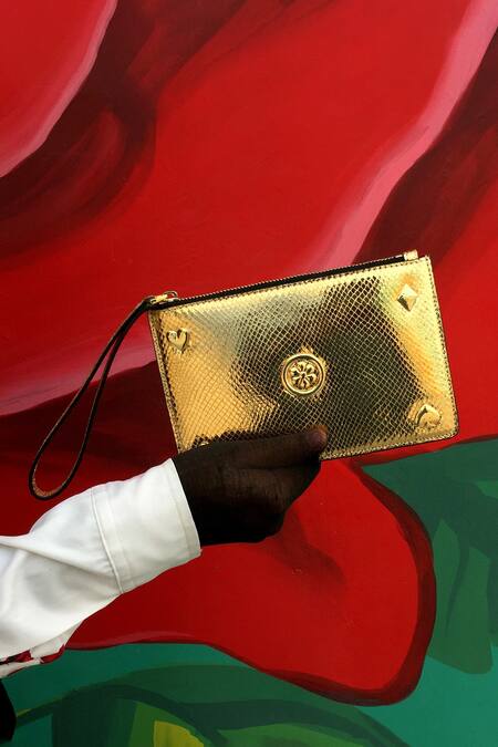 Gold genuine leather clutch featuring a structured rectangular shape with a textured pattern