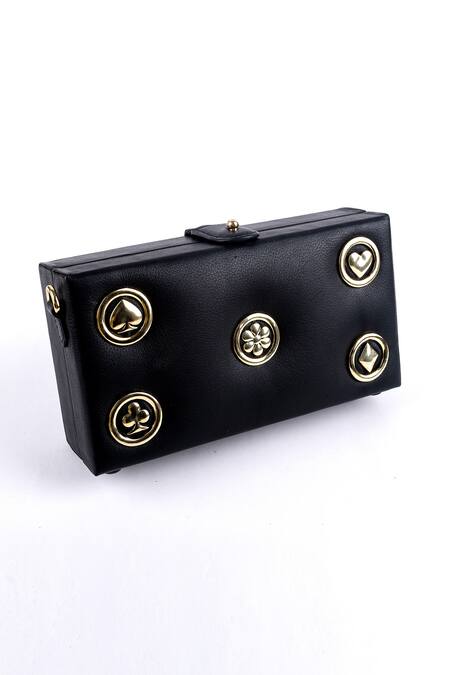 Black clutch bag made from genuine leather featuring 24k gold plated embellishments in flower, heart, club, diamond, and spade motifs