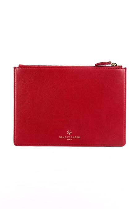 Haute red genuine leather clutch featuring a rectangle structured shape and a Goddess Lakshmi motif carved embellishment