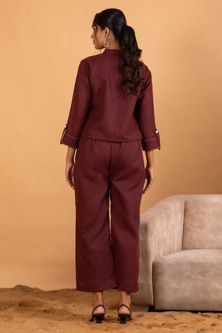 Maroon Linen Embroidery Mandarin Collar Button Down Top And Pant Set