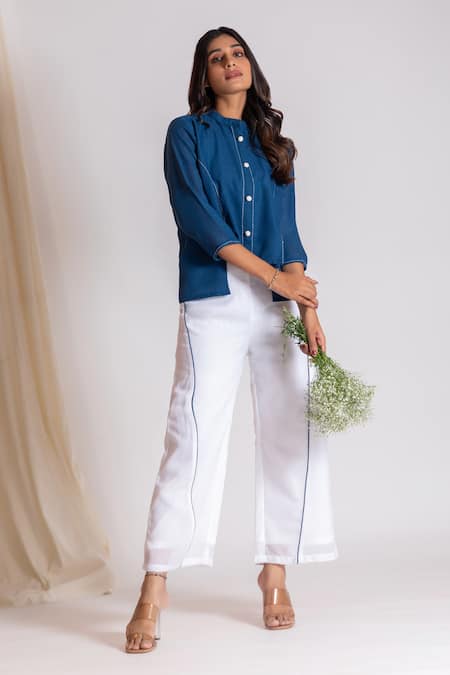 Blue shirt featuring stitchline thread placement embroidery and mandarin collar. Paired with pipe embroidered flared pant.