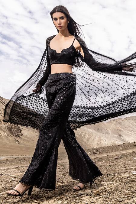 Black Georgette, Net Sequins, Cut Work Cutdana And Embroidered Cape Pant Set