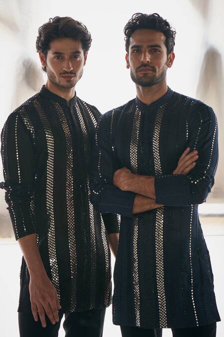 Blue kurta featuring metal sequins and cutdana stripe pattern embroidery with a stand collar. Paired with black pant, this set is crafted from georgette fabric and designed with three quarter sleeves.