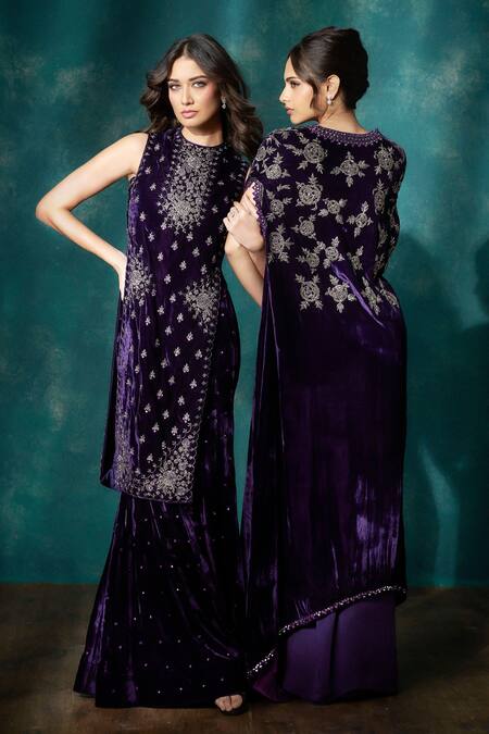 Purple velvet kurta featuring floral motifs with cutdana and jewel embroidery. Paired with a matching sharara adorned with similar embroidery.