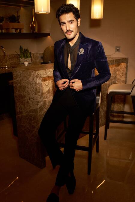 Midnight blue velvet jacket featuring crystal embroidered floral patterns. Paired with matching pant for a complete look.