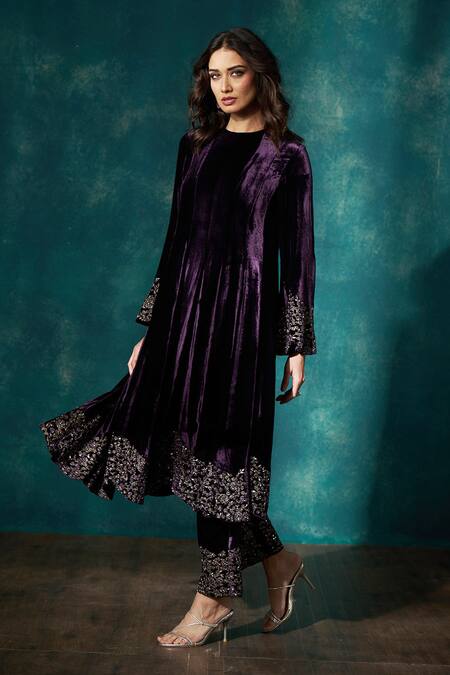 Wine velvet anarkali featuring placed floral motifs border embroidered with gunmetal cutdana. Paired with matching pant adorned with cutdana embroidered borders.