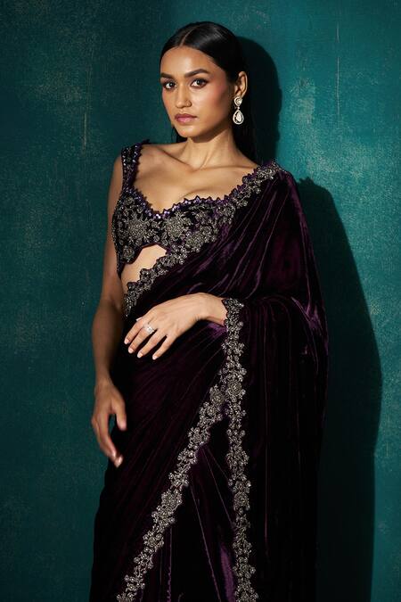 Wine velvet saree featuring floral motifs embroidered with cutdana, mirrorwork, and cut-out borders. Paired with a cutdana embroidered padded blouse and petticoat.