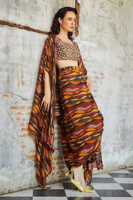 Multi color asymmetric jacket featuring geometric patterns and cape sleeves. Paired with an embroidered padded blouse and a drape skirt with attached lining.
