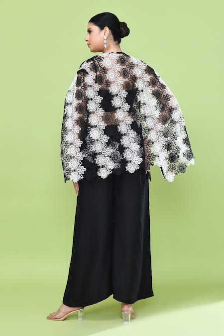 Black & white center lace cape, Open front cape design, Wide-leg pants