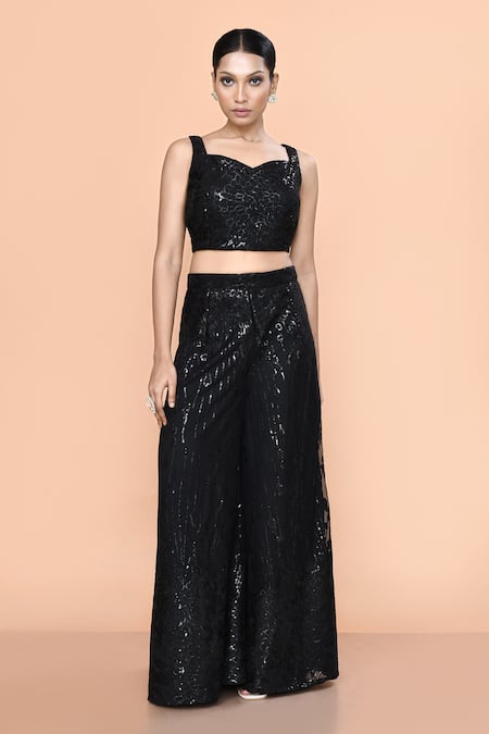 Black Net Sequins, Embroidery Sweetheart Neck Embellished Palazzo And Crop Top Set