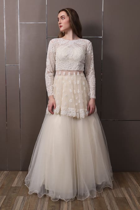 Buy_Sayisha_Off White Net Embroidery, Sequins Boat Neck Hand Kurta Lehenga Set_Online_at_Aza_Fashions