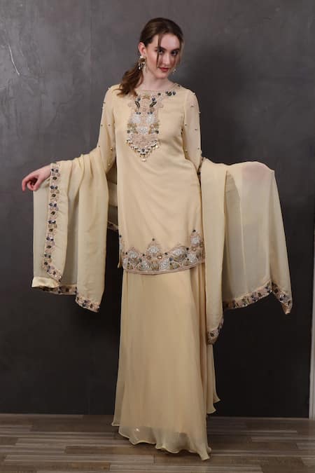 Beige kurta featuring round neckline, full sleeves, and hand embroidery with glass beads, pearls, and sequins. Paired with a plain skirt and a dupatta with hand embroidered border.