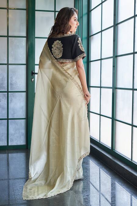 Beige saree crafted from tissue silk featuring sequin and bead embroidered scallop hem. Paired with a blue floral embroidered padded blouse.