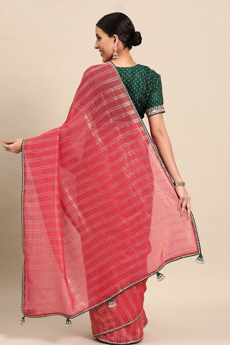 Red silk saree featuring stripe woven motifs with sequin and zardozi embroidered border. Comes with a running blouse piece.