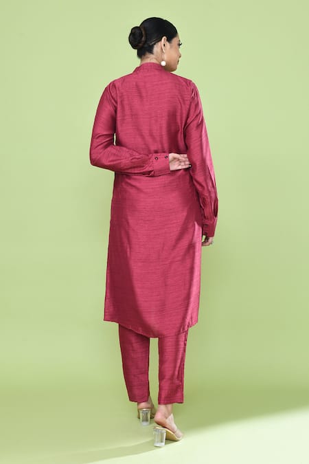 A red silk kurta featuring a band collar, full button placket, full sleeves, and side pockets. It is paired with coordinating red silk pants with an attached lining.