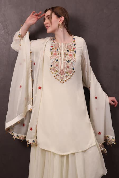 Off white kurta featuring hand embroidery with thread, glass beads, and crystals. Paired with a plain palazzo and a hand embroidered dupatta.