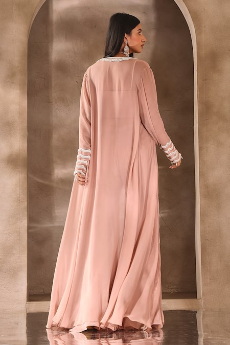 Dusty pink embroidered blouse featuring a scoop neckline and sleeveless design. Paired with a matching gharara and a georgette jacket with scallop detailing and full sleeves.