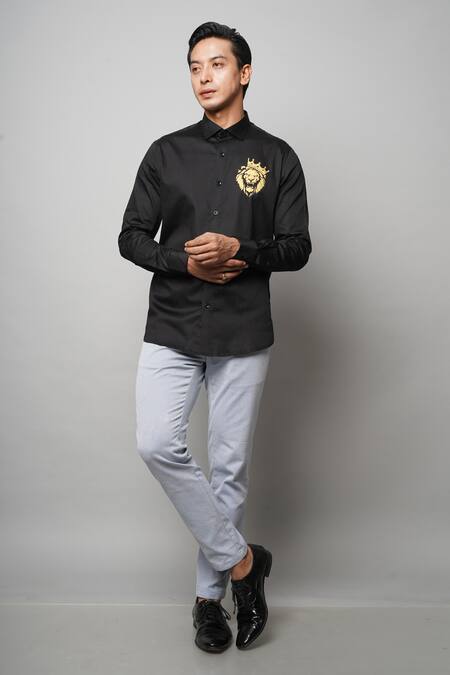 Black cotton shirt with hand-painted gold lion motif on the side.
